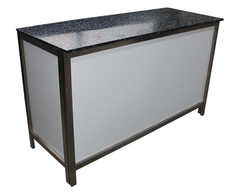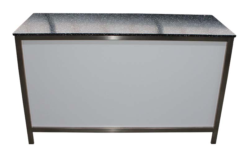 Wir bieten Ihnen dazu die entsprechende Getränketheke. Die schwarz/weiß gemusterte Theke mit Aluminiumgestell und weißer Front hat eine Größe von 1,5m x 0,6m und ist ca. 90cm hoch.