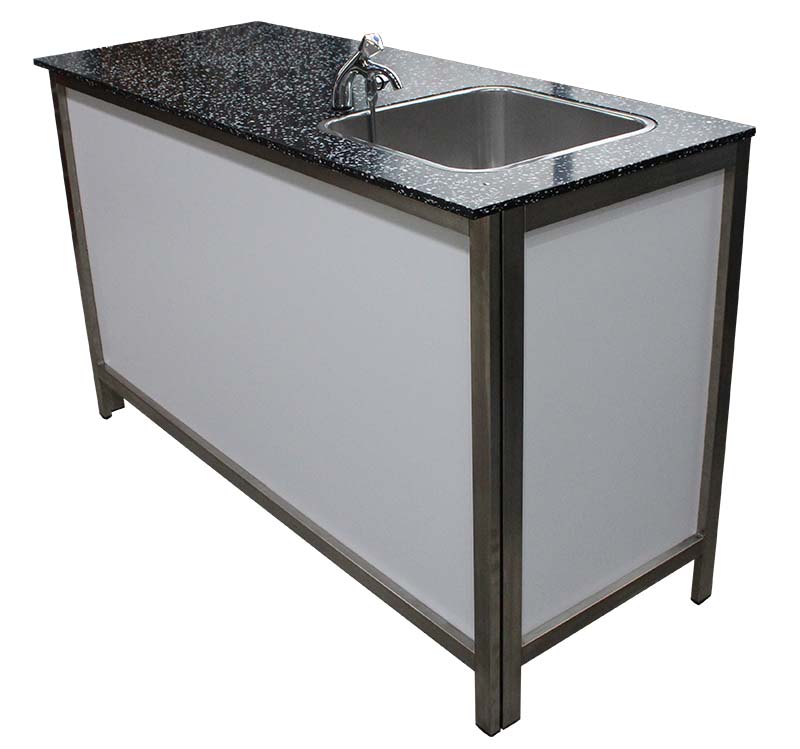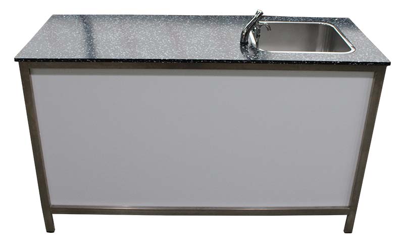 Die Theke hat ein integriertes Waschbecken mit Wasseranschluss. Das Waschbecken ist tief genug, um Gläser spülen zu können. Die Gläserspülbürste wird mitgeliefert. Alles was Sie vor Ort benötigen, ist ein Frischwasser- und Abwasseranschluss.