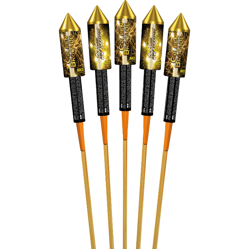 5-teiliges Raketensortiment, 2-fach sortiert. Exklusive Raketen mit ausgewählten Gold-Effekten und lautstarker Zerlegung.