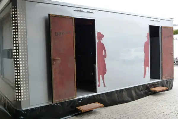 - Damenseite: 4x Design-Keramiktoiletten, 2x zart geschwungene Waschtische mit Warm- und Kaltwasserversorgung aus modernen Armaturen